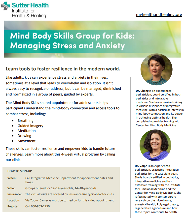 For appointment dates, times, or to learn more, call the Integrative Medicine Department at (650) 853-2250 or email IntegrativeMed@sutterhealth.org Note: This series is not limited to established PAMF patients. Each session will be billed to insurance as a virtual visit, prospective participants should confirm coverage, and any applicable co-pay, for these visits with their insurance provider prior to registering.