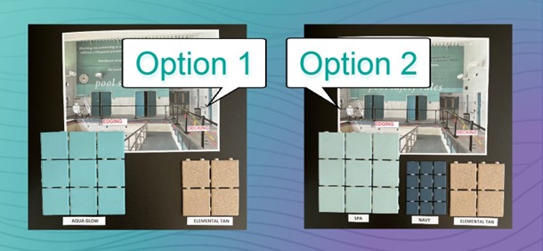 With 53% of the votes, Spa* tile color for the pool edge and Navy tile color for the words spelling out “Men” and “Women” on the floor outside the locker rooms won. *Spa is just the brand name of the color and not a new feature at the pool.