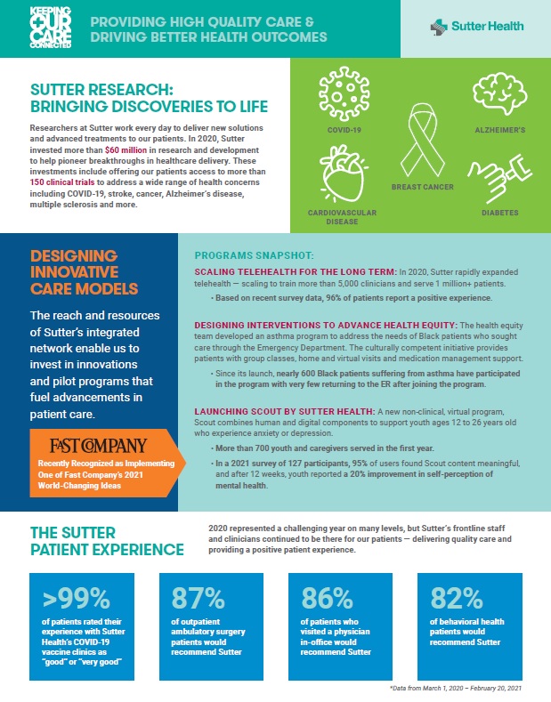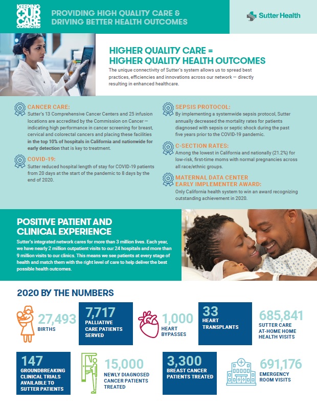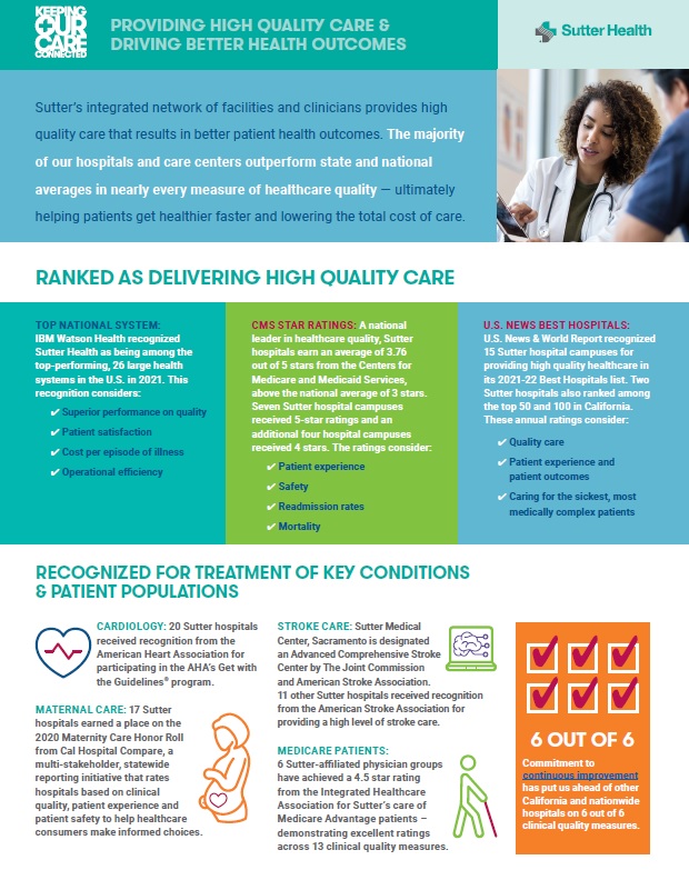 Sutter recently released an infographic that shows how the health system stacks up on quality measures and offers more examples of how its investments in quality make a difference for patients and society. Click these links (page one) (page two) (page three) to view each page in full screen.