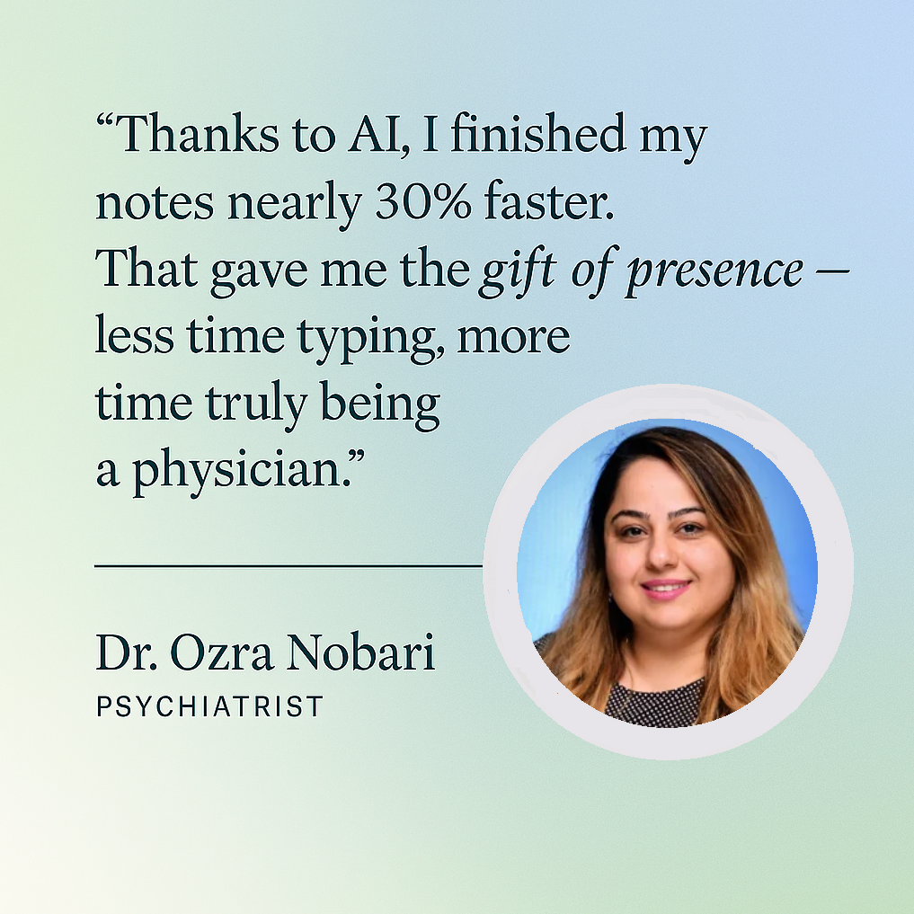 “Due to the nature of the care provided, psychiatrists spend long hours documenting their observations. This time was different. I turned on my AI note taker and forgot about documentation. Finally, I was fully present. I was able to closely monitor my patient’s progress, adjust the dose of medicine, fine-tune his behavioral activation plan, make numerous calls with his family to both learn and update, and coordinate the delicate dance with our amazing nursing team, pharmacy team and psychiatry technicians. The result? A boy who hadn’t moved or spoken just days earlier, completely disconnected from the world, took a step toward healing — and I watched hope spark in his family and in my team’s eyes. ~ Dr. Ozra Nobari