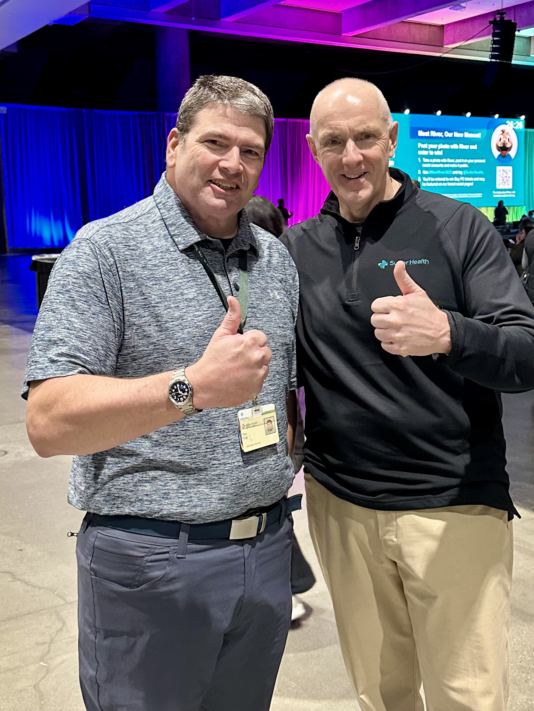 Tim Tritt, a Sutter employee, poses with Sutter CEO Warner Thomas after recovering from cancer of the tongue