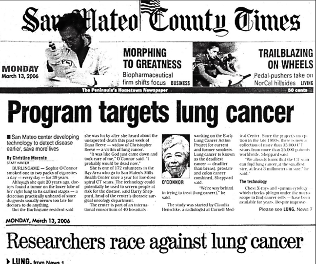 In 2003, the Dorothy Schneider Cancer Center at the San Mateo campus of Sutter’s Mills-Peninsula Medical Center was the first site in the Bay Area, and the sole community hospital, to offer access to a clinical trial testing if computed tomography scans, with a reduced dose of radiation, could detect lung cancer at Stage 1 or 2. At the time, screening was already successful at catching breast cancer earlier, when it is easier to treat, but lung cancer detection lagged behind.